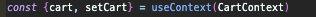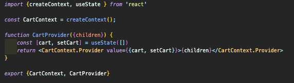 As you can see in the code above you need to import createContext from react. Then we need to set our createContext to a variable, in this code we are passing a cart state variable to multiple components, so we named ours CartContext.