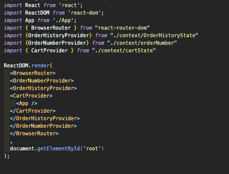 Now we leave this folder and go into our index.js file and wrap our entire App in our Provider so every component can access our context.